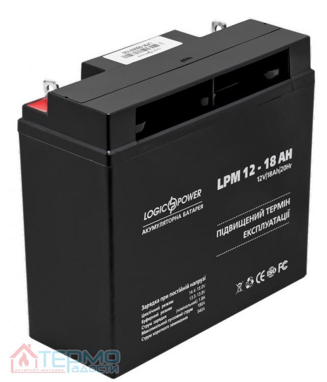 Бренд: LogicPower; Модель: LPM 12 - 18 AH; Тип батареи: кислотный; Напряжение: 12V; Емкость: 18 Ач; Габариты: 180х75х166 мм.; Вес: 5 кг; Производство: Китай; Гарантия: 12 месяцев.