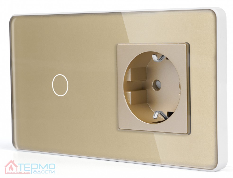 Сенсорный выключатель (1 клавиша) + Розетка с З/К | Золото, Стеклянная панель — это стильное и практичное устройство, которое сочетает управление освещением и возможность подключения бытовых приборов. Современный дизайн, удобство установки и безопасность делают его идеальным выбором для дома или офиса.