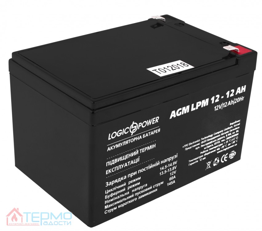 Бренд: LogicPower; Модель: LPM 12 – 12 AH; Тип батареї: кислотний; Напруга: 12V; Місткість: 12,0 Ач; Габарити: 150х98х99 мм.; Вага: 3 кг; Виробництво: Китай; Гарантія: 12 місяців.