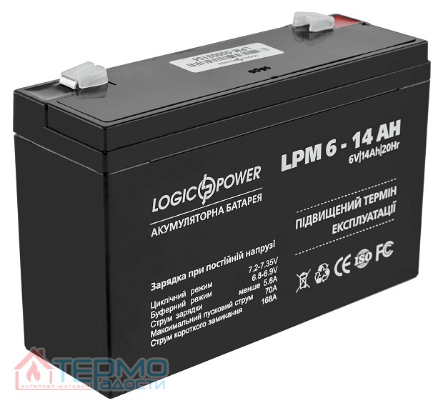 Бренд: LogicPower; Модель: AGM LPM 6-14 AH; Тип батареї: свинцево-кислотний; Напруга: 6V; Місткість: 14 Ач; Габарити: 151x50x96 мм.; Вага: 1 кг; Виробництво: Китай; Гарантія: 12 місяців.