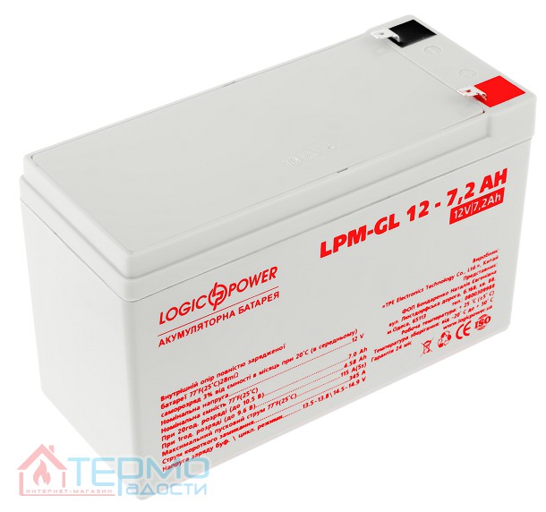 Бренд: LogicPower; Модель: LPM-GL 12 – 7.2 AH; Тип батареї: гелевий; Напруга: 12V; Місткість: 7,2 Ач; Габарити: 150x65x95 мм.; Вага: 2 кг; Виробництво: Китай; Гарантія: 12 місяців.